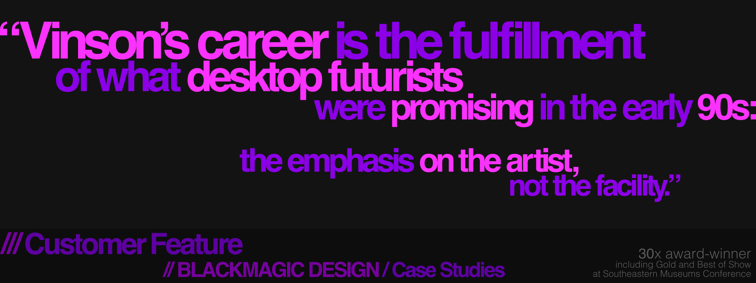 According to Blackmagic Design’s Case Study Customer Web Feature “Vinson’s career is the fulfillment of what desktop futurists were promising in the early 90s: the emphasis on the artist, not the facility.” At in-house agencies David guided shared creative efforts on branding and commercial execution for NBATV, The Weather Channel, Ford, Time Warner Cable, Moe’s Southwest Grill, Viking, Birmingham Southern College, The Preakness, and Paula Deen & Smithfield; video installations for Raytheon, World of Coke, The Harmon, and United States Postal Inspection Service at the Smithsonian; website lead-in animations for UPS and Universal; and corporate videos for BBVA Compass, Mohawk, Wiser, United States Postal Service, Bridgestone Corporation & Bridgestone Golf, and Southern Living At Home.