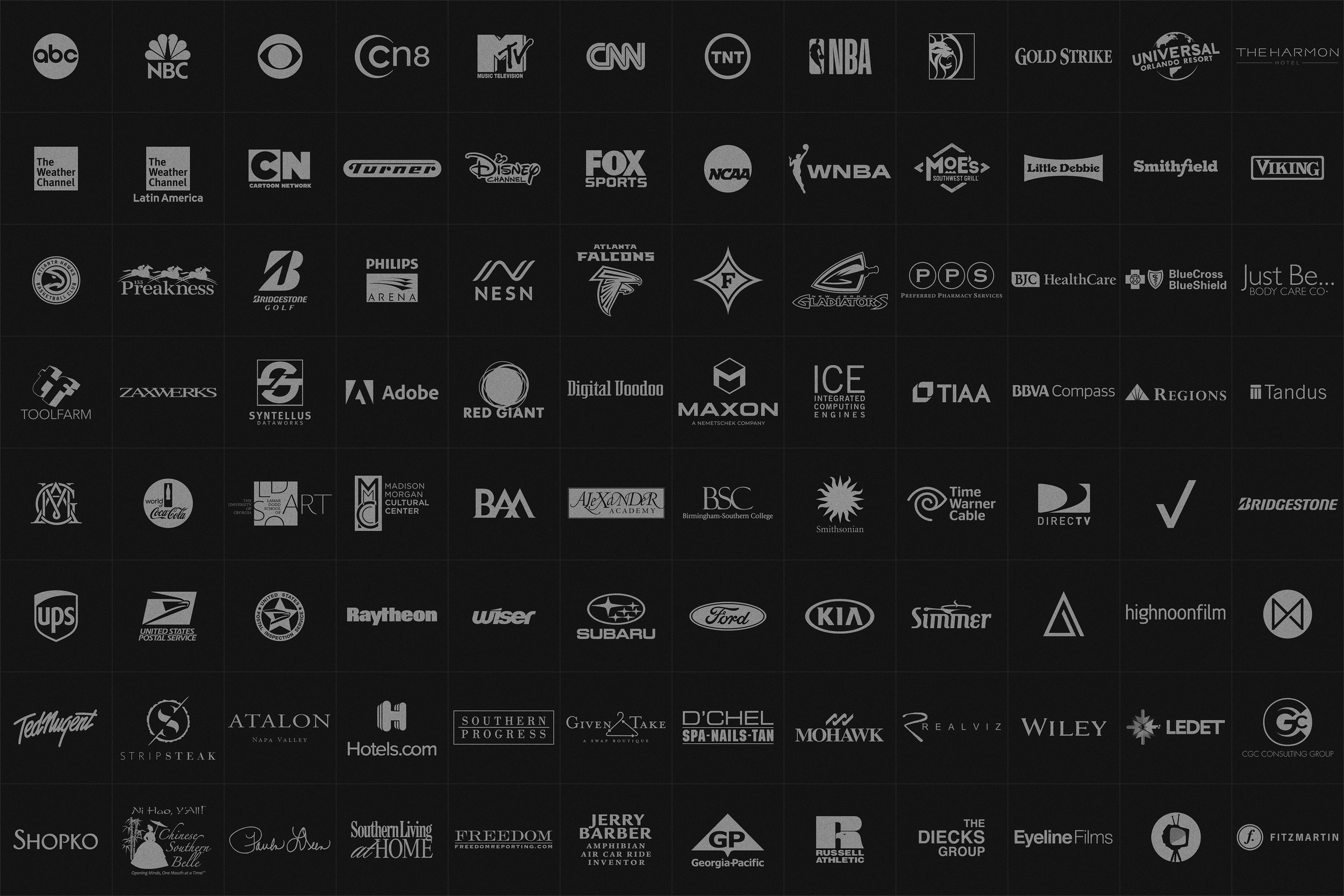 Collaborators: ABC, NBC, CBS, CNN, TNT, MTV Puerto Rico, NBA TV, Fox Sports, New England Sports Network, Atlanta Hawks, The Weather Channel, The Weather Channel Latin America, CN8 The Comcast Network, DirecTV, Philips Arena, Russell Athletic, Little Debbie, Georgia Pacific Television, Ford, Verizon, Tandus, Adobe, Red Giant Software, Zaxwerks, Regions Bank, Ted and Shemane Nugent’s SpiritWild Productions, Bozeman Art Museum, Georgia Museum of Art, Madison Morgan Cultural Center, TIAA-CREF, Southern Progress, Southern Living At Home, Toolfarm, Ledet, and Digital Voodoo.