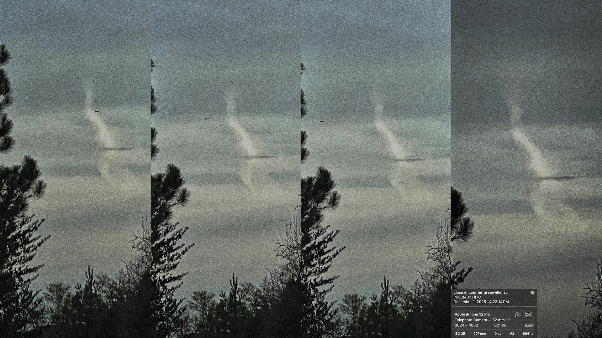 “I want to believe.” This is the first time I’ve witnessed a UAP/UFO in person. On December 1, 2025, one-hundred yards from Swamp Rabbit Trail in Greenville, South Carolina, I noticed an odd vapor trail among the clouds. It was very erratic compared to most trails left by traditional aircraft. At first I didn’t even notice the disc until a friend of mine pointed it out. The object never moved an inch. It was hovering. Two seconds after I took these four photos the disc-shaped anomaly disappeared. It was gone instantaneously. Familiar, as I’d seen it before thirty years ago.
